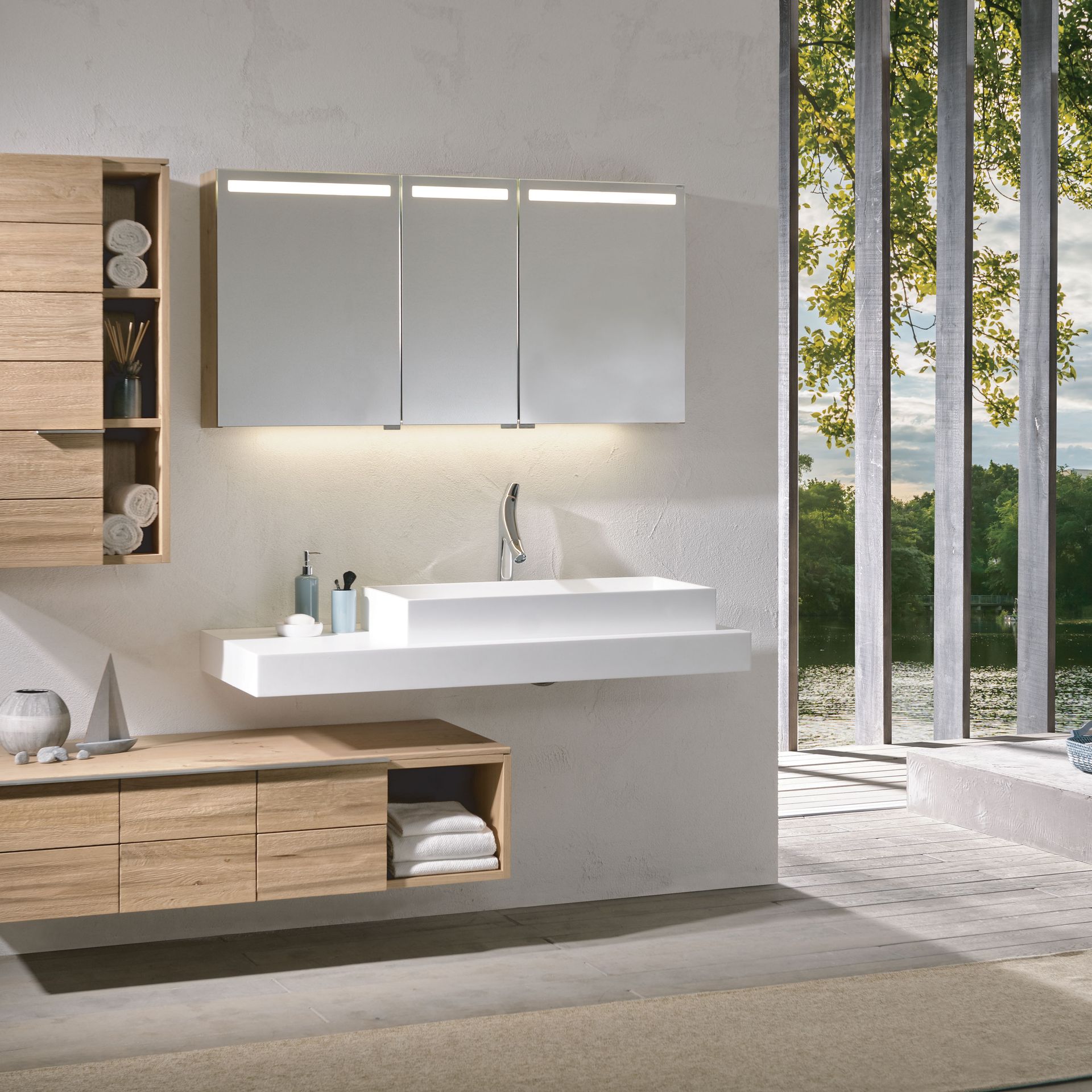 Das Badezimmerlicht sollte nach Möglichkeit freundlich sein. Denn wenn einen das eigene Spiegelbild nicht nur unausgeschlafen, sondern auch bis ins letzte Detail ausgeleuchtet am Morgen begrüßt, dreht man am liebsten gleich wieder um. Für einen guten Start in den Tag ist daher eine ausgewogene und stimmungsvolle Beleuchtung vorteilhaft. Sie sorgt außerdem für ein freundliches Wohlfühlambiente und ideale Lichtverhältnisse. Eine extra Wandlampe oder eine dimmbare Spiegelleuchte machen da bereits einen großen Unterschied.