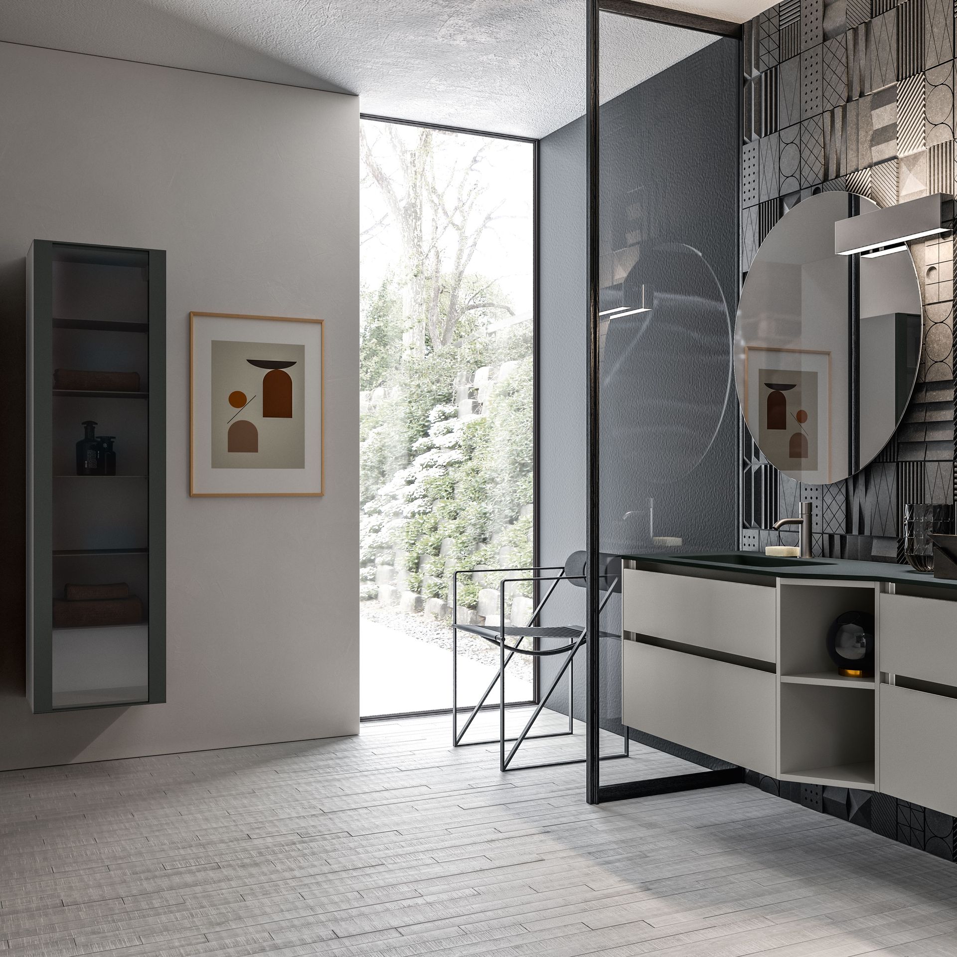 La luce del bagno dovrebbe possibilmente essere una luce gentile. Perché se lo specchio al mattino ci rimanda il nostro sguardo ancora mezzo assonnato, illuminando impietosamente fino all’ultimo dettaglio del viso, si vorrebbe subito tornare a spegnere la luce. Per un buon inizio della giornata è più conveniente quindi un’illuminazione equilibrata e d’atmosfera che oltretutto, ha anche il pregio di creare un ambiente accogliente e condizioni di luce ideali. Una lampada a parete supplementare o una luce dimmerabile integrata nella specchiera possono fare la differenza.